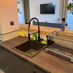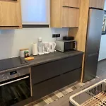 Among the self-catering amenities provided is a fully equipped kitchen with an electric kettle, a refrigerator, and an oven.